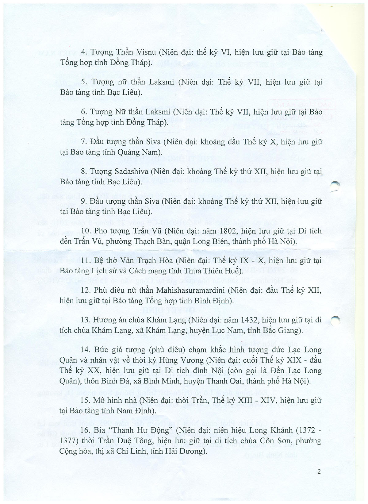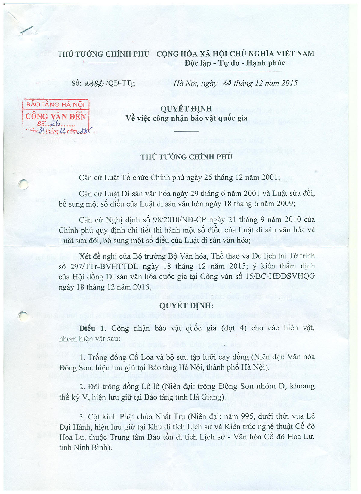 được Phó Thủ tướng Vũ Đức Đam công nhận là bảo vật quốc gia (đợt 10) theo Quyết định số