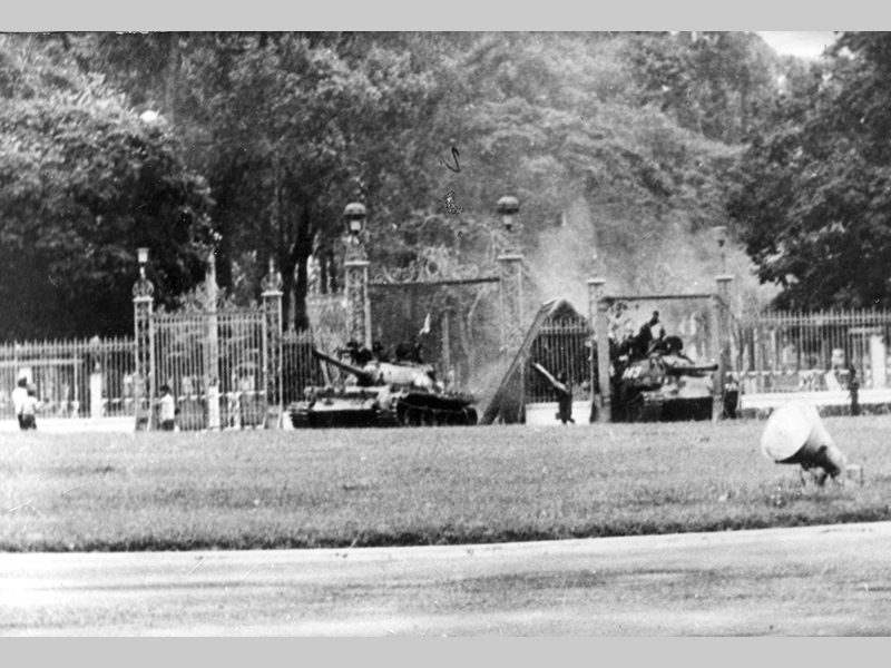 Ảnh: Xe tăng quân Giải phóng húc đổ cánh cổng thép tại Dinh Độc Lập, ngày 30/4/1975.
