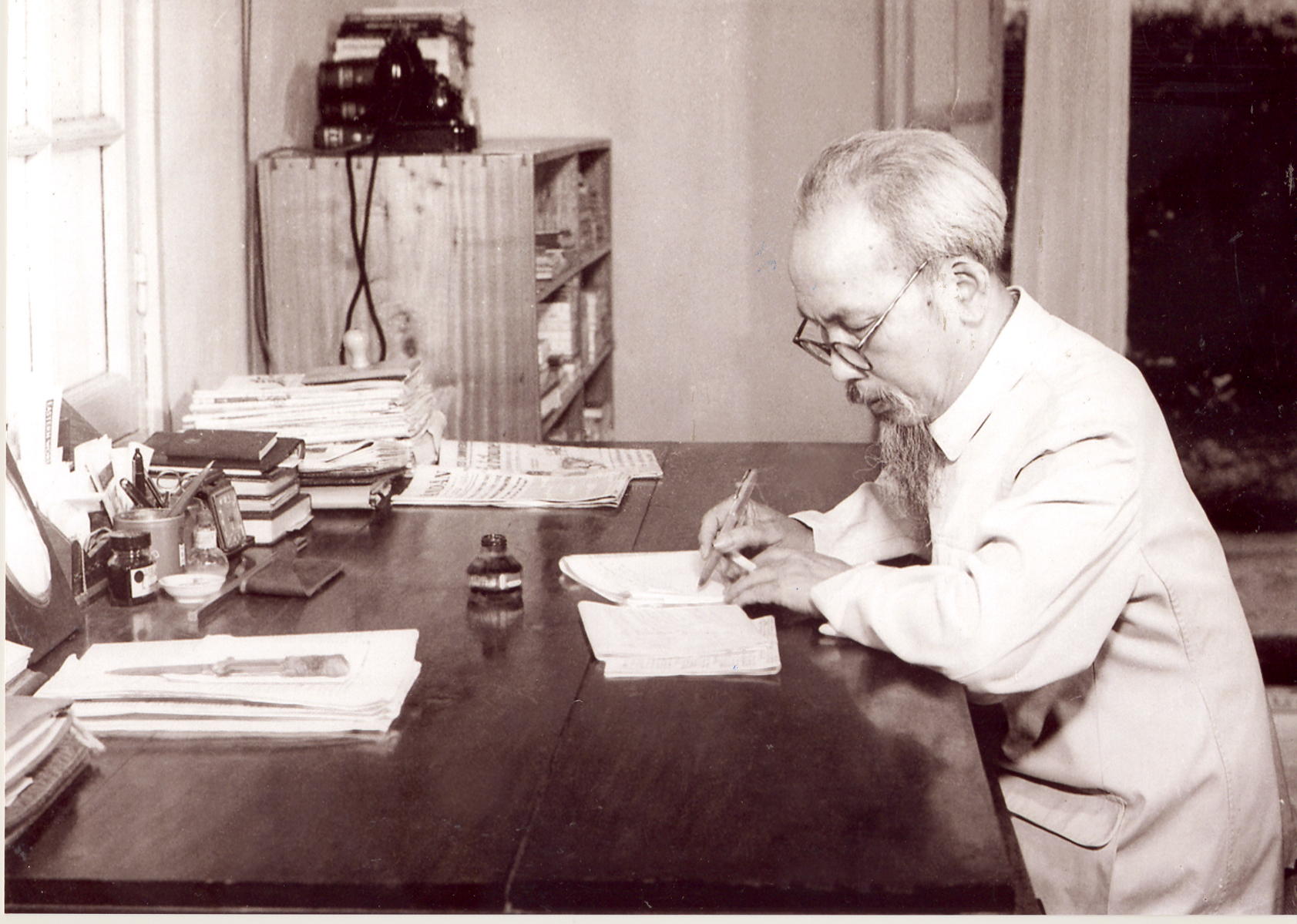 Ảnh: Bác Hồ đang làm việc tại Nhà sàn