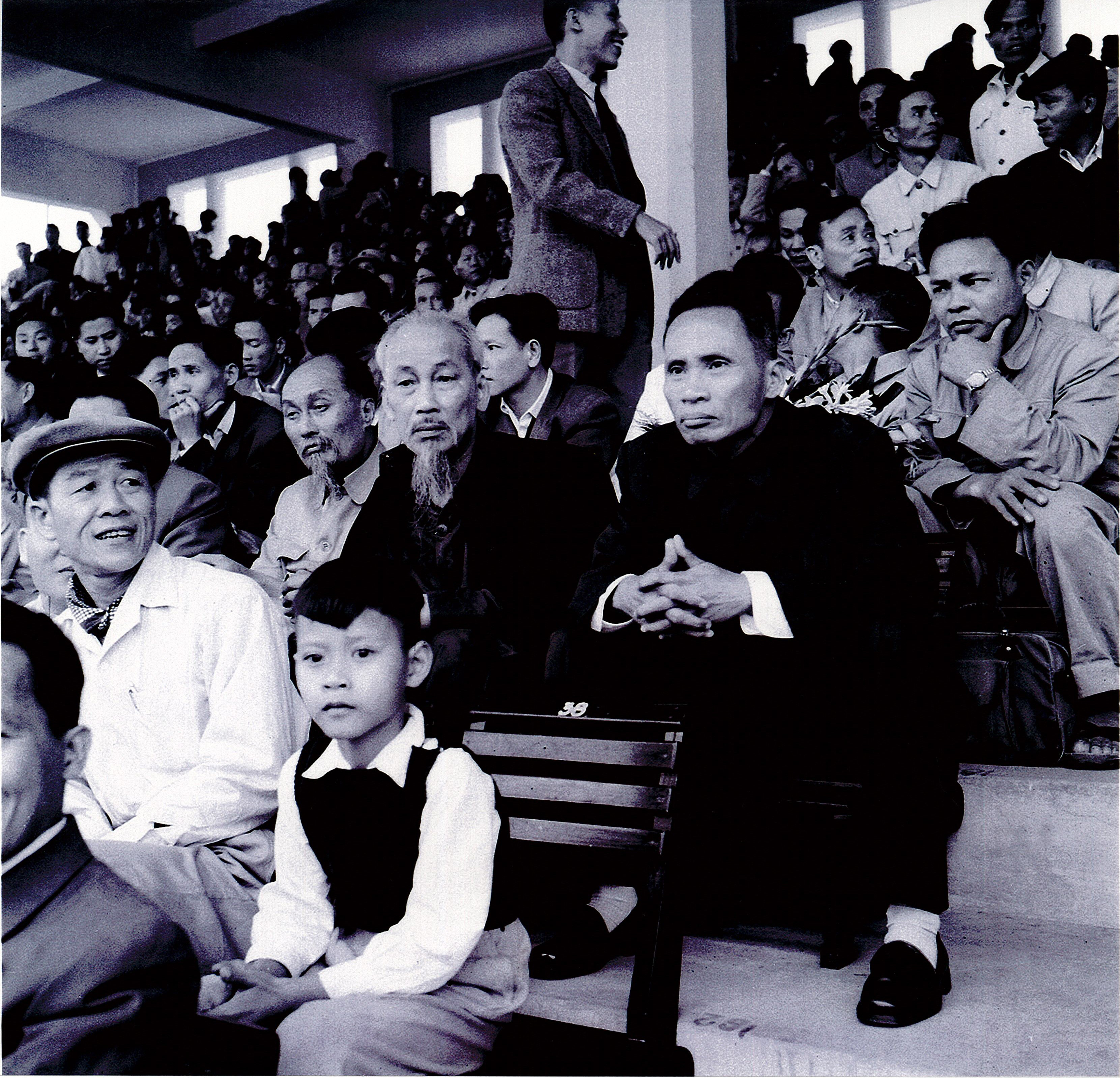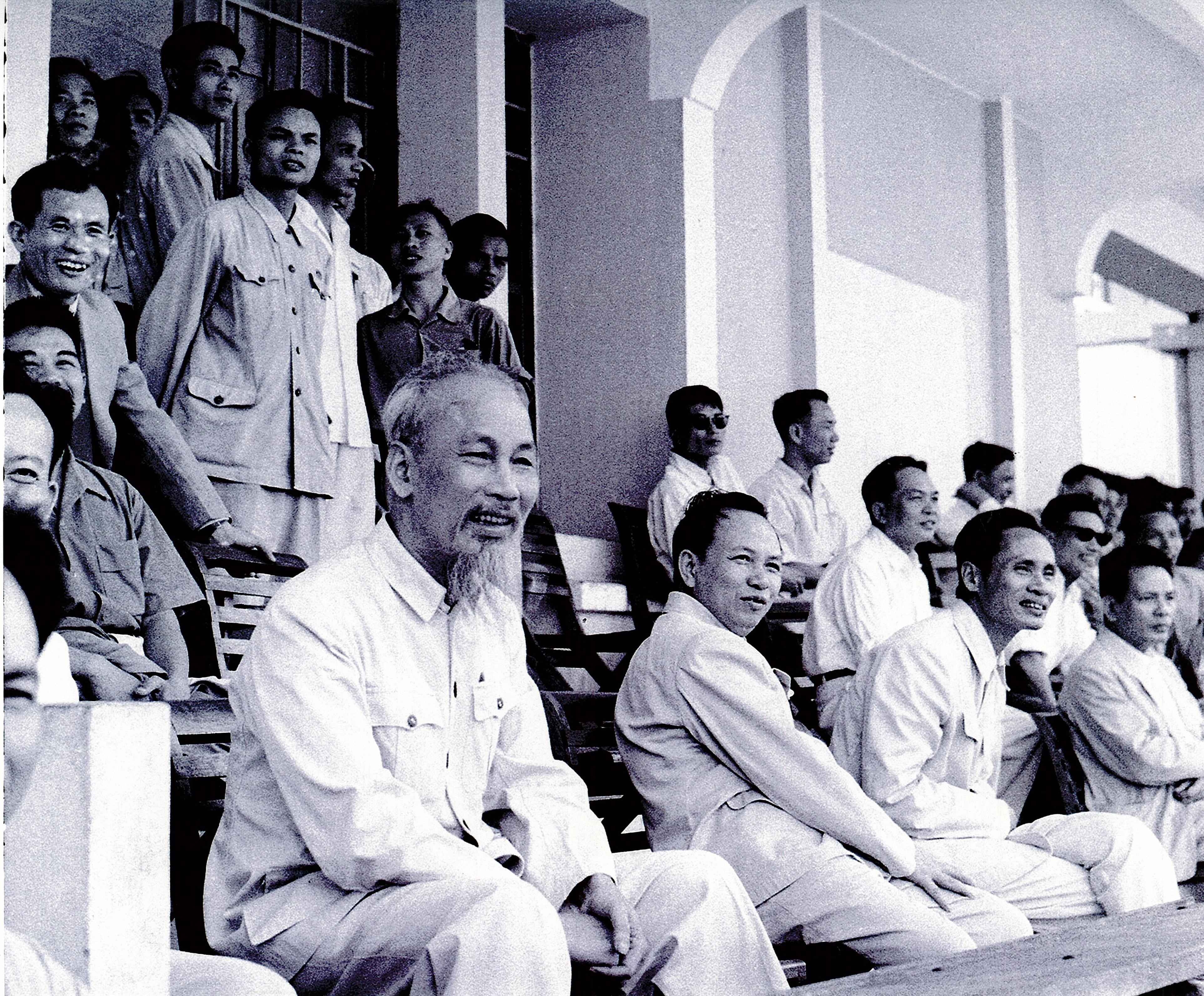 Ảnh: Bác Hồ cùng các đồng chí lãnh đạo Đảng và Nhà nước xem trận thi đấu bóng đá giữa Tổng cục Bưu Điện và công nhân Cảng Hà Nội tại sân vận động Cột Cờ, ngày 1/5/1957.