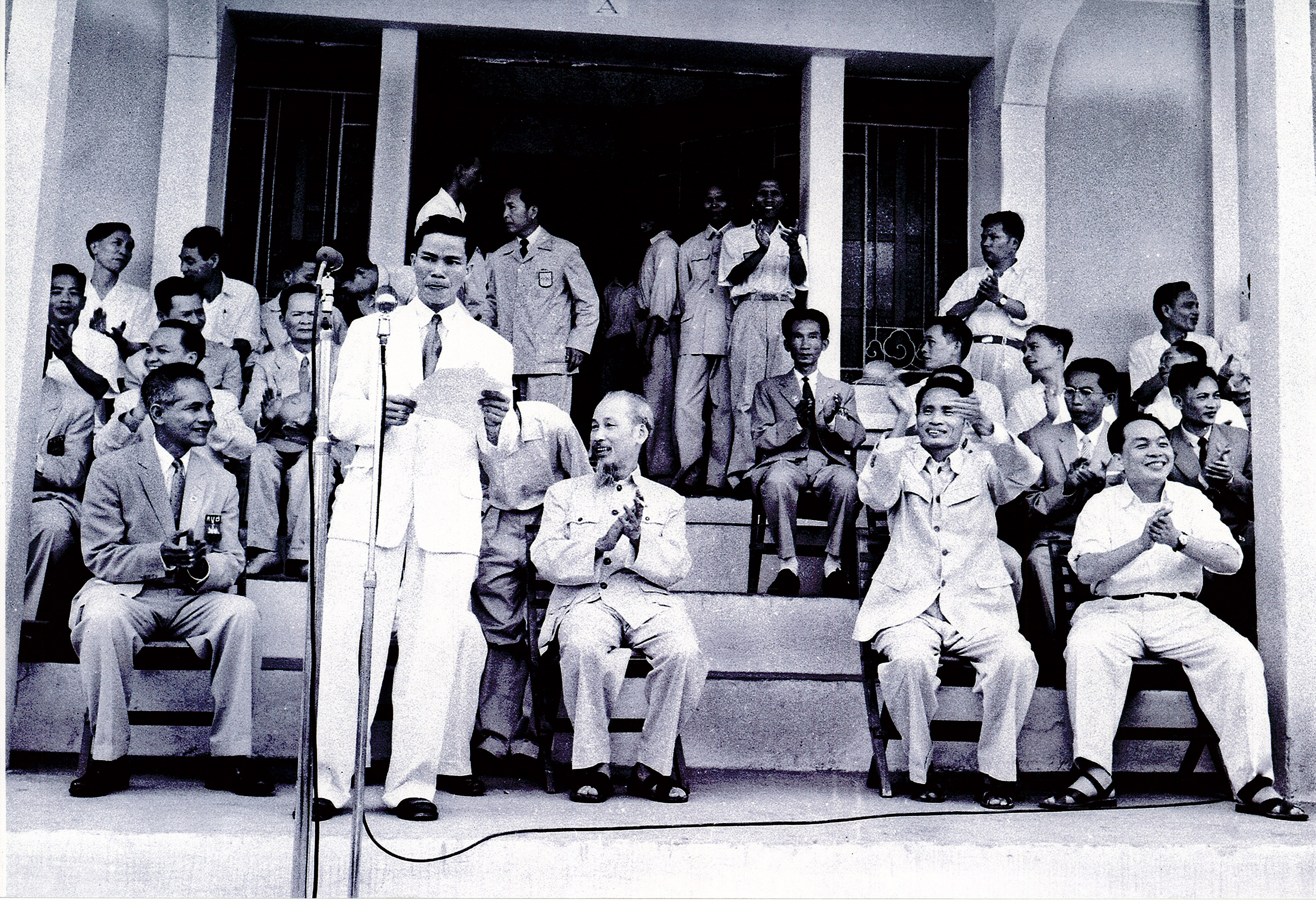 Ảnh: Bác Hồ cùng các đồng chí lãnh đạo Đảng và Nhà nước xem trận thi đấu bóng đá giữa tuyển Campuchia và đội tuyển Hà Nội tại sân vận động Cột Cờ, ngày 26/5/1957.