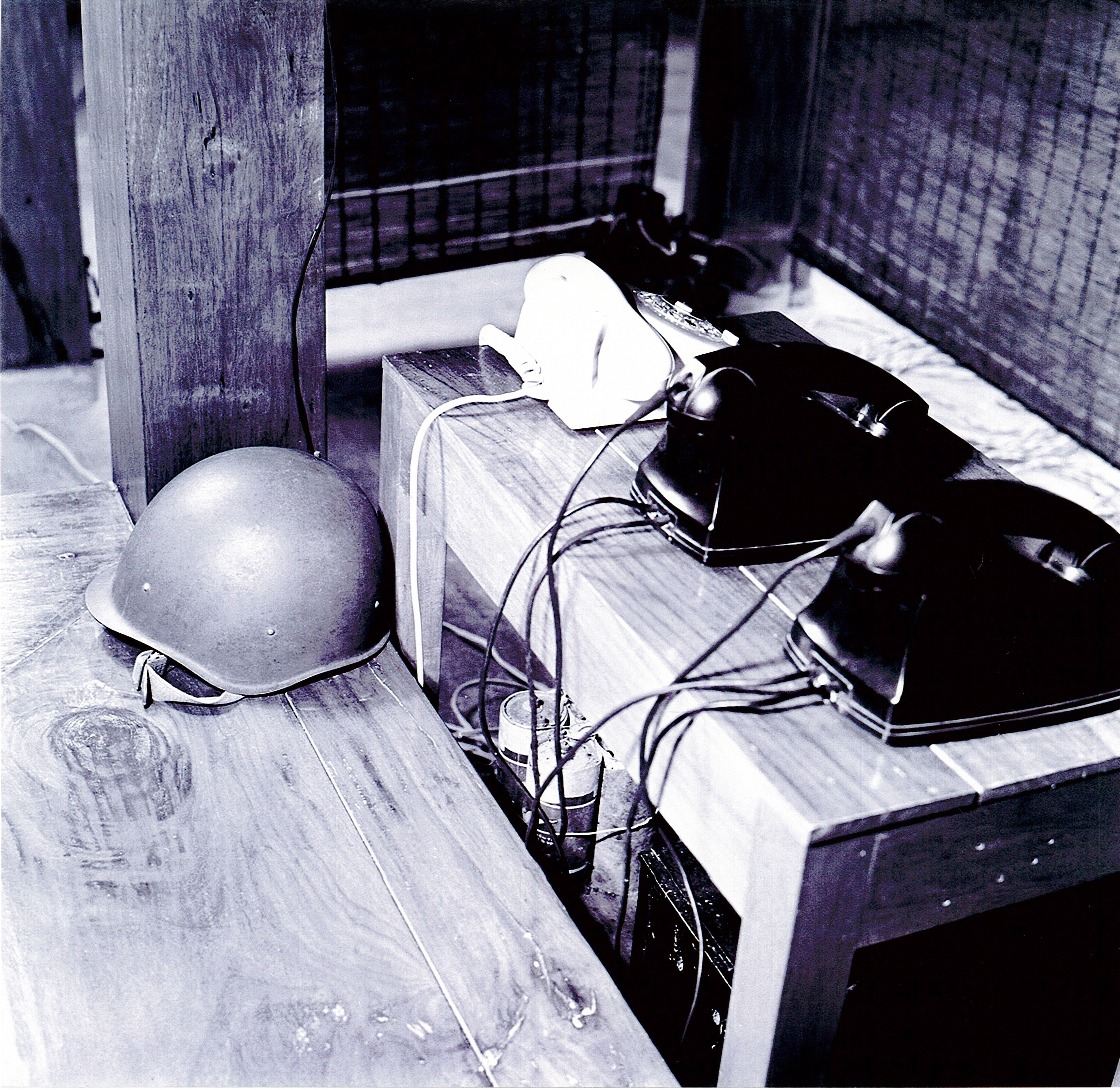 Ảnh: Chiếc mũ phòng không và hệ thống máy điện thoại được Bộ Tư lệnh Thông tin lắp đặt tại phòng làm việc của Bác Hồ trong ngôi nhà sàn.