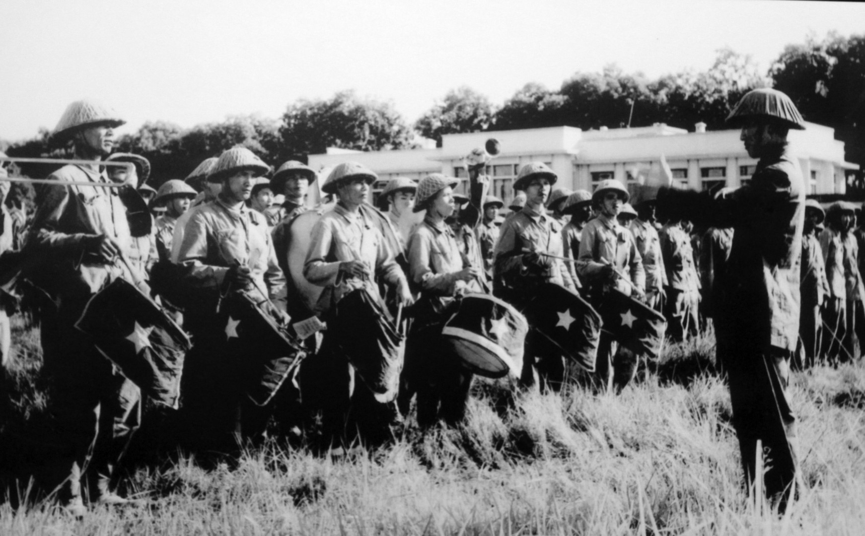 Đồng chí Đinh Ngọc Liên chỉ huy đội quân nhạc trong lễ chào cờ chiến thắng, ngày 10/10/1954.