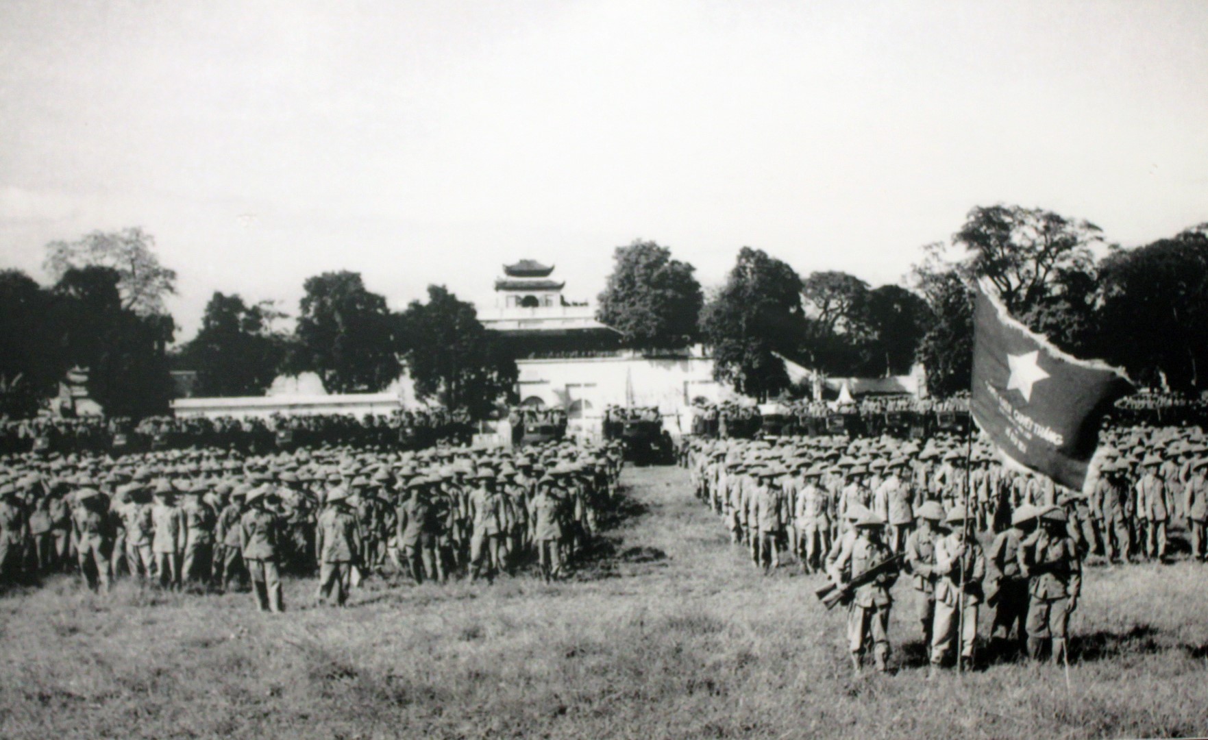 Tại sân Cột Cờ đại quân ta chuẩn bị làm lễ chào cờ, phía sau là Đoan Môn, thành Hà Nội, ngày 10/10/1954.