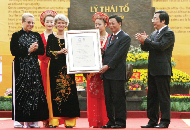 Tổng Giám đốc UNESCO đã trao Bằng chứng nhận Di sản Văn hoá Thế giới Trung tâm Hoàng thành Thăng Long cho UBND thành phố Hà Nội trong dịp đại lễ 1000 năm Thăng Long - Hà Nội, ngày 1/10/2010