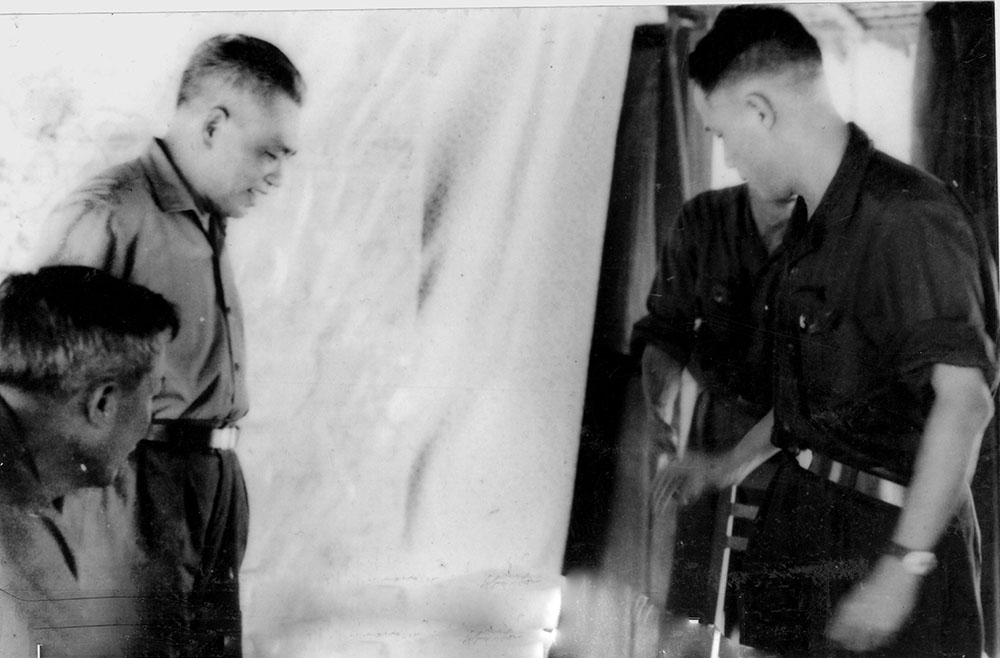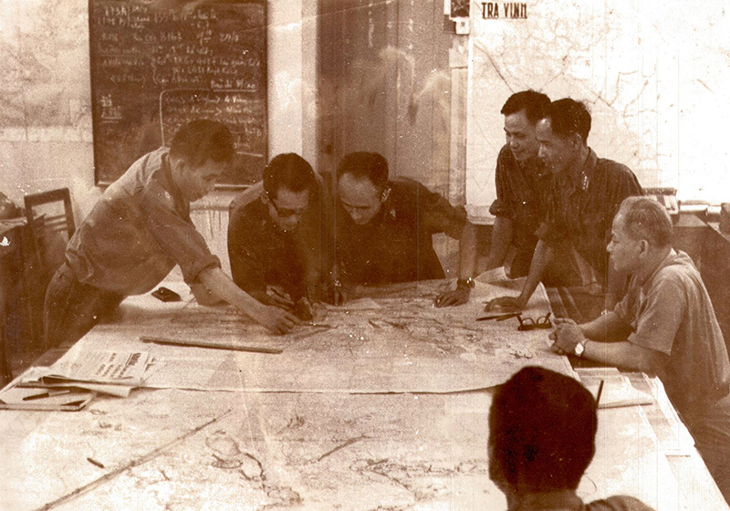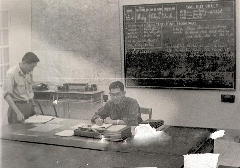 Cán bộ Cục Tác chiến trao đổi tình hình chiến trường tại Sở Chỉ huy Bộ Tổng Tham mưu, năm 1975.