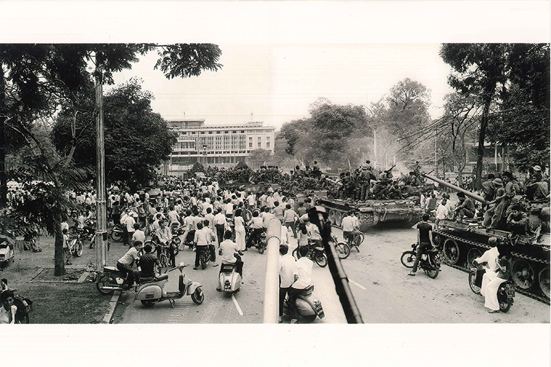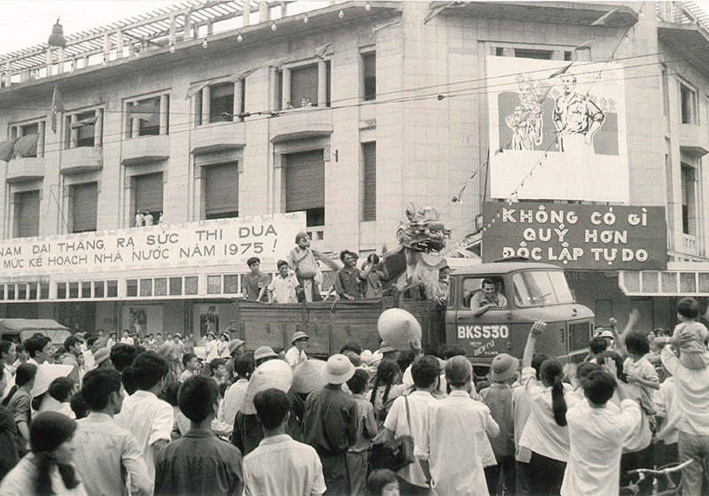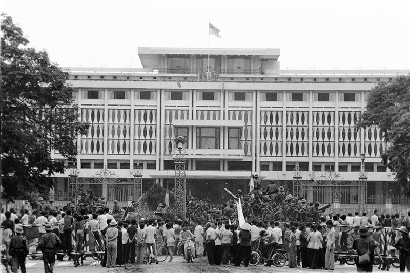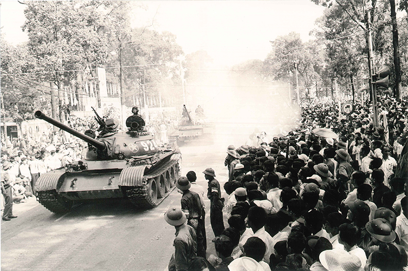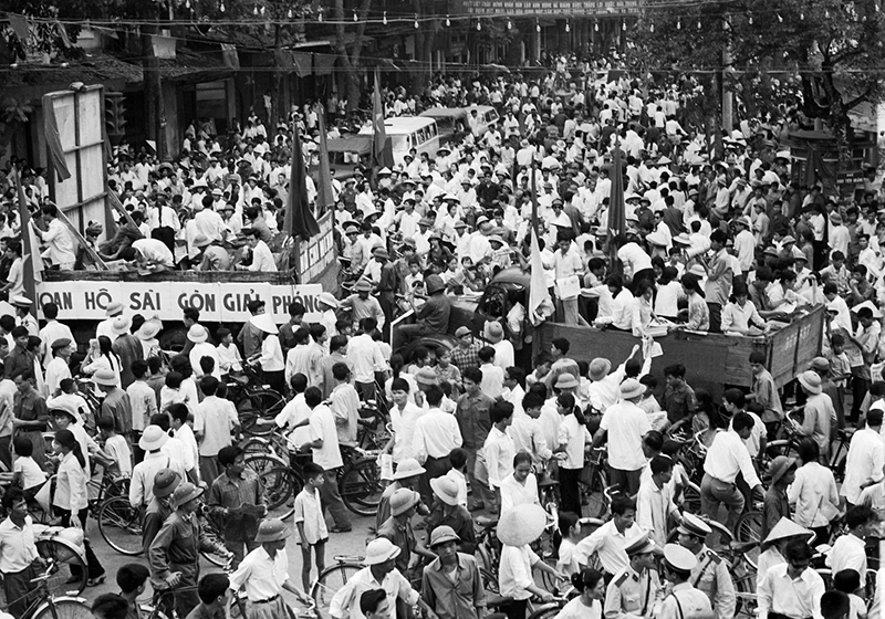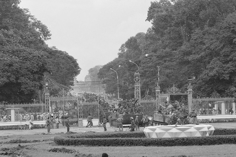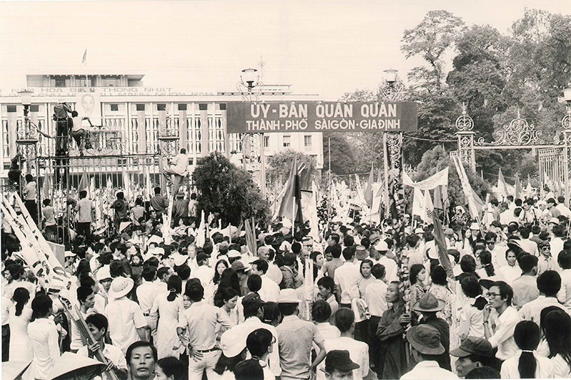 Người dân Sài Gòn xuống đường hò reo đón chào bộ đội cách mạng. Cờ đỏ sao vàng, cờ Chính phủ cách mạng lâm thời Cộng hòa miền Nam Việt Nam rợp các đường phố. Bà con cô bác, nam nữ thanh niên, các cháu thiếu nhi vây quanh các anh bộ đội, vây quanh những chiếc xe tăng, những khẩu pháo, nét mặt ai nấy đều hân hoan rạng rỡ. Cả Sài Gòn, cả Việt Nam lúc ấy sống trong niềm vui vô tận. Ðó là niềm vui giải phóng của cả dân tộc Việt Nam vẫn luôn mong đợi. Trong giờ phút hào hùng của lịch sử đó non sông đã chính thức thu về một mối, Nam - Bắc sum họp một nhà.