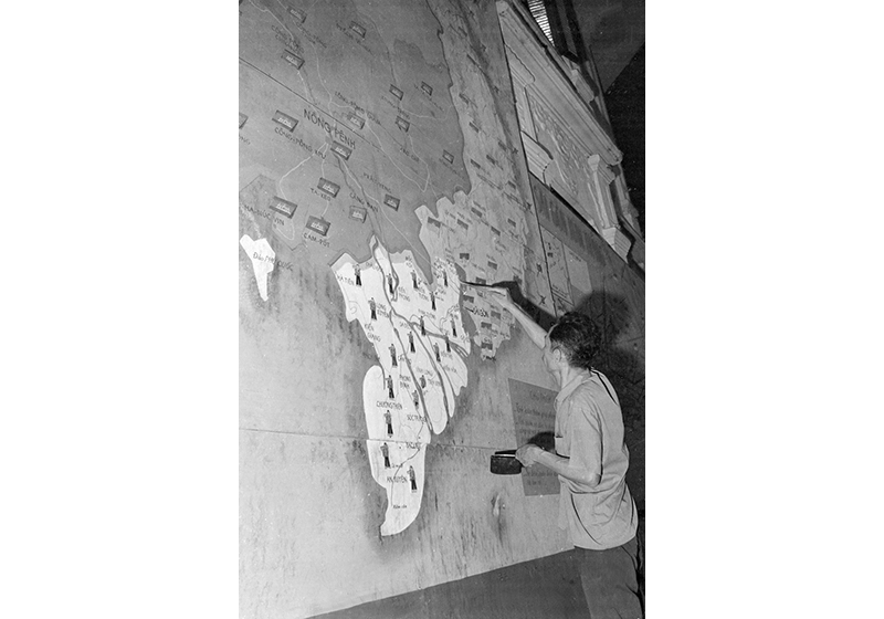 Cán bộ Cục Tác chiến đang nghiên cứu tình hình chiến trường trên bản đồ, năm 1975