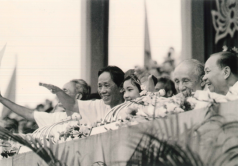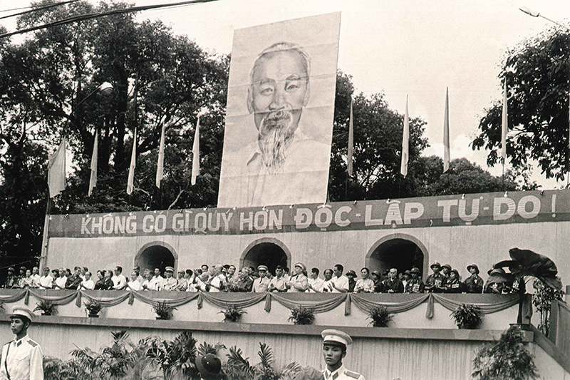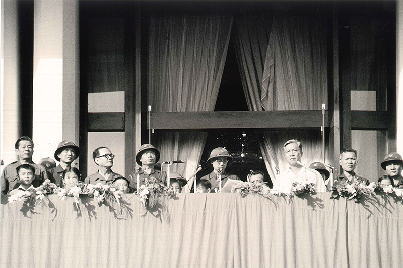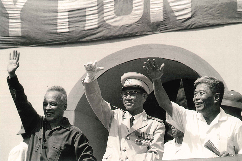 và đồng chí Phạm Hùng trên lễ đài mừng chiến thắng,
