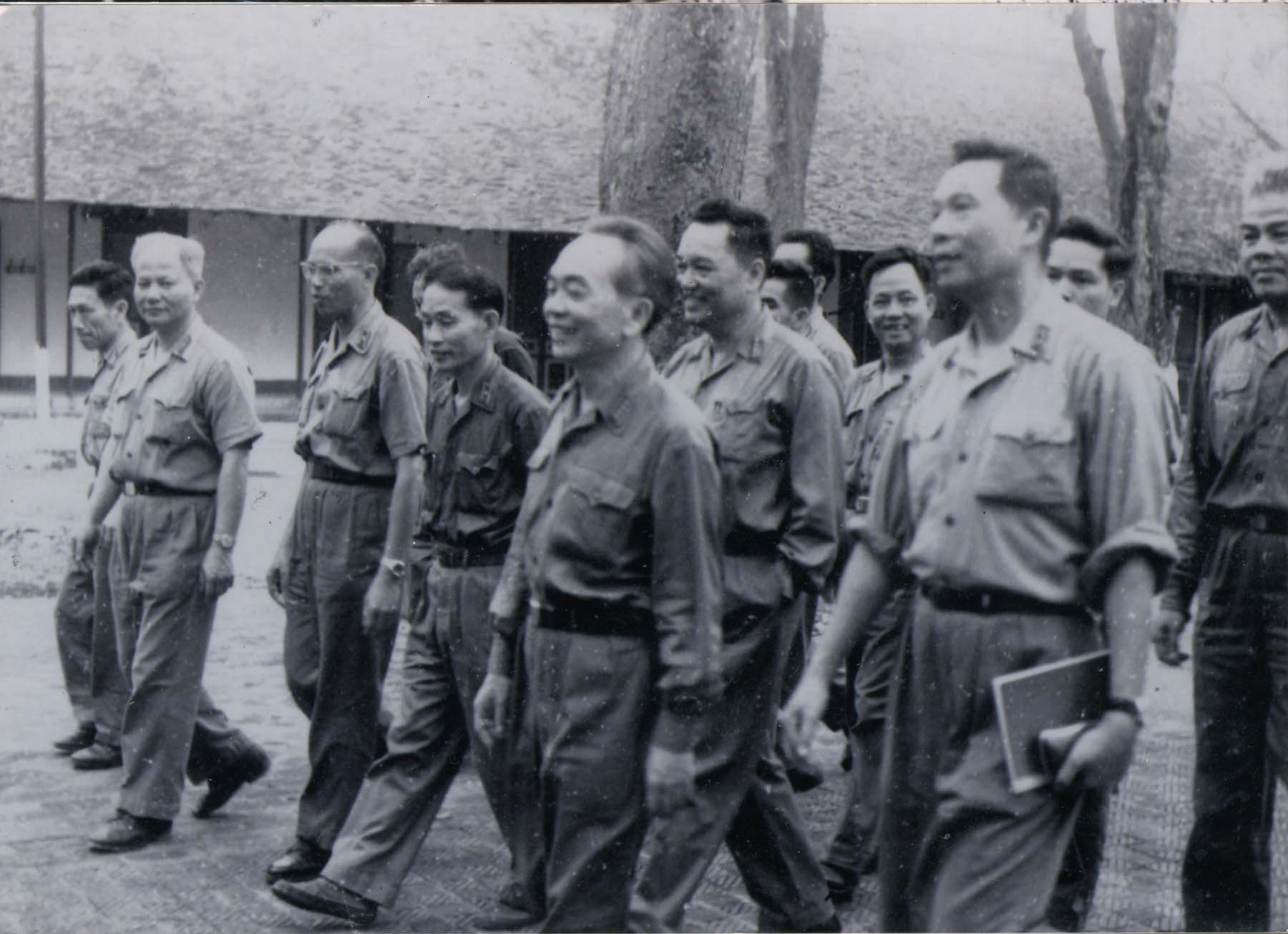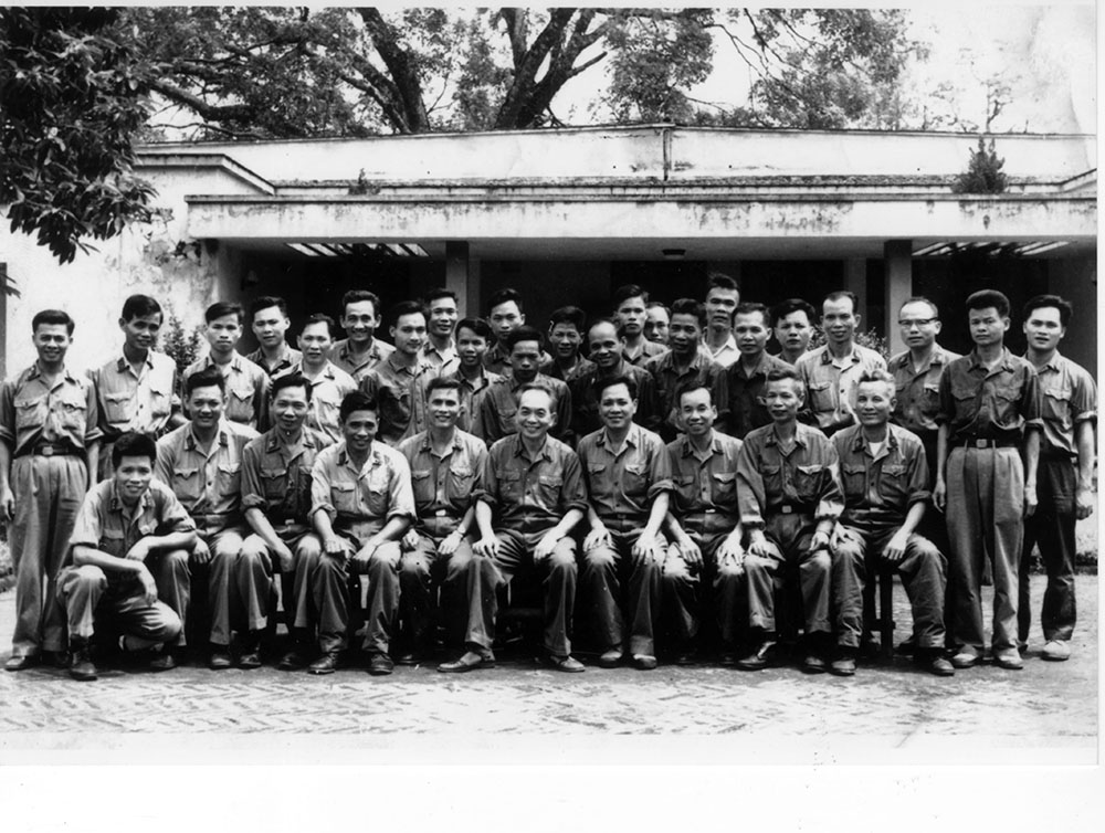 Đại tướng Võ Nguyên Giáp cùng các cán bộ Bộ Quốc phòng Quân đội Nhân dân Việt Nam chụp ảnh mừng chiến thắng trước nhà Quân ủy Trung ương (Nhà D67), ngày 30/4/1975
