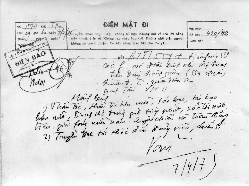 Bức điện mật đi số 1574 của Đại tướng Võ Nguyên Giáp từ Tổng hành dinh, lệnh cho các đơn vị: “Thần tốc, thần tốc hơn nữa, táo bạo, táo bạo hơn nữa. Tranh thủ từng giờ từng phút xốc tới mặt trận, giải phóng miền Nam. Quyết chiến và toàn thắng”, ngày 7/4/1975.
