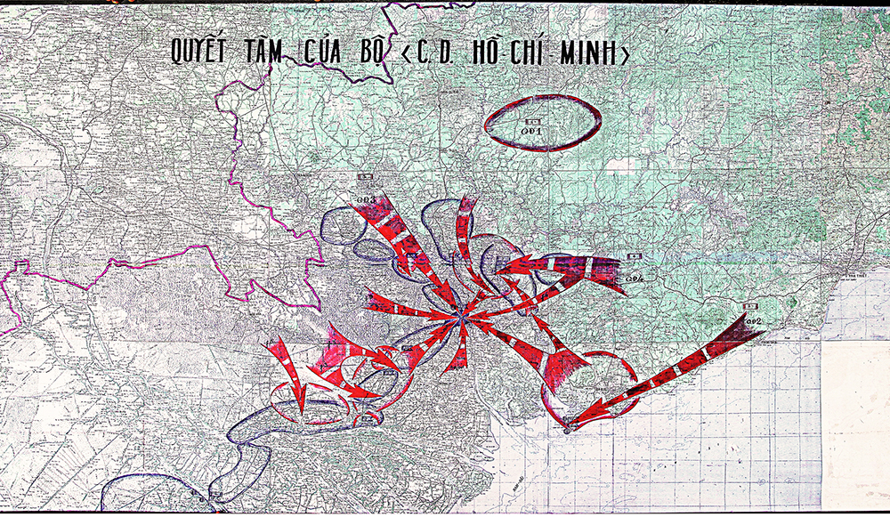 Bản đồ Quyết tâm Chiến dịch Hồ Chí Minh thể hiện các lực lượng quân Giải phóng trên tất cae 5 hướng đồng loạt nổ súng tấn công vào Sài Gòn, ngày 26/4/1975.
