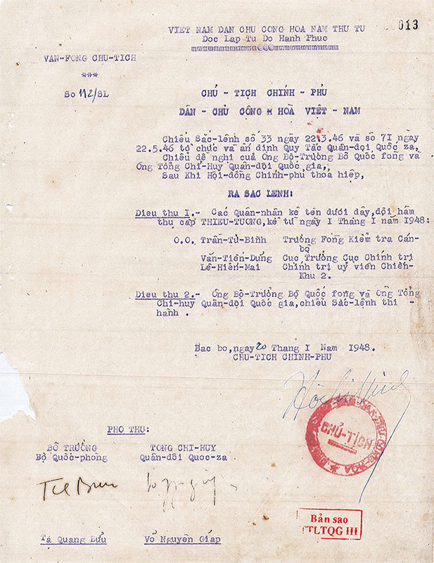 Sắc lệnh số 220/SL về việc nhân dịp kỉ niệm ngày 02/9/1954, thưởng Huân chương Quân công hạng Nhì đối với Thiếu tướng Văn Tiến Dũng - Tổng Tham mưu trưởng Quân đội Nhân dân Việt Nam.