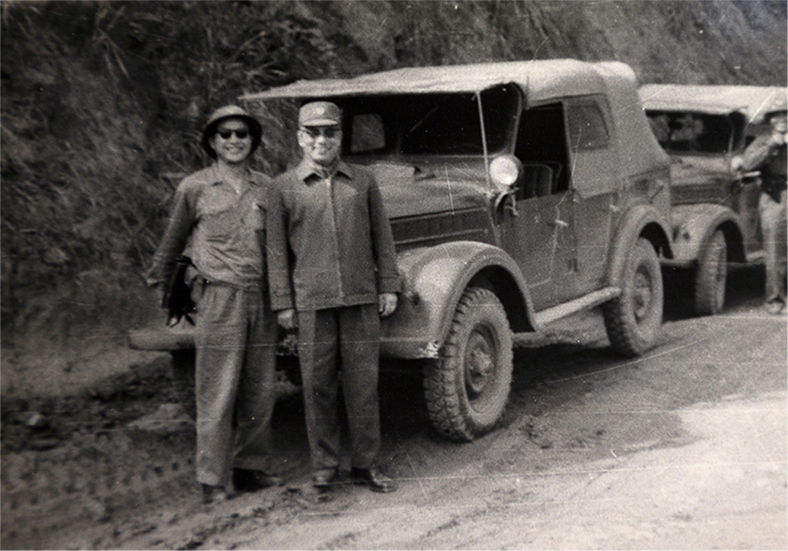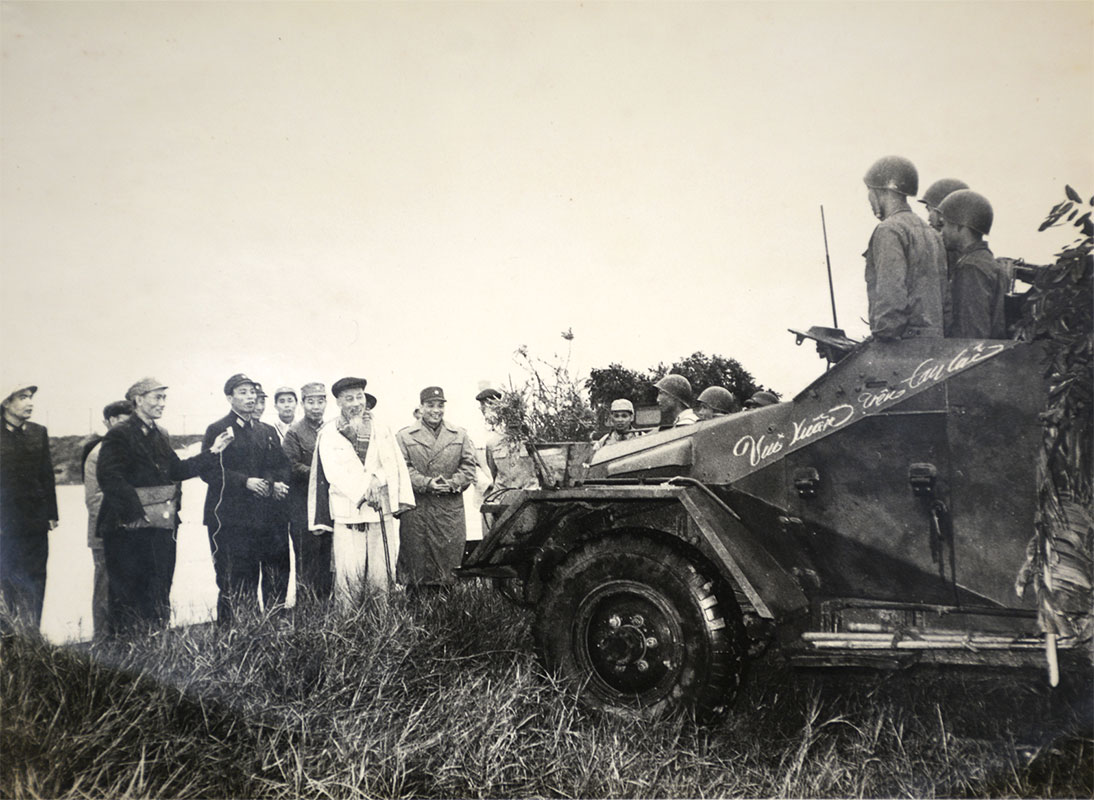 Thiếu tướng, trưởng đoàn Văn Tiến Dũng đi trên chiếc xe Jeep sơn dòng chữ: