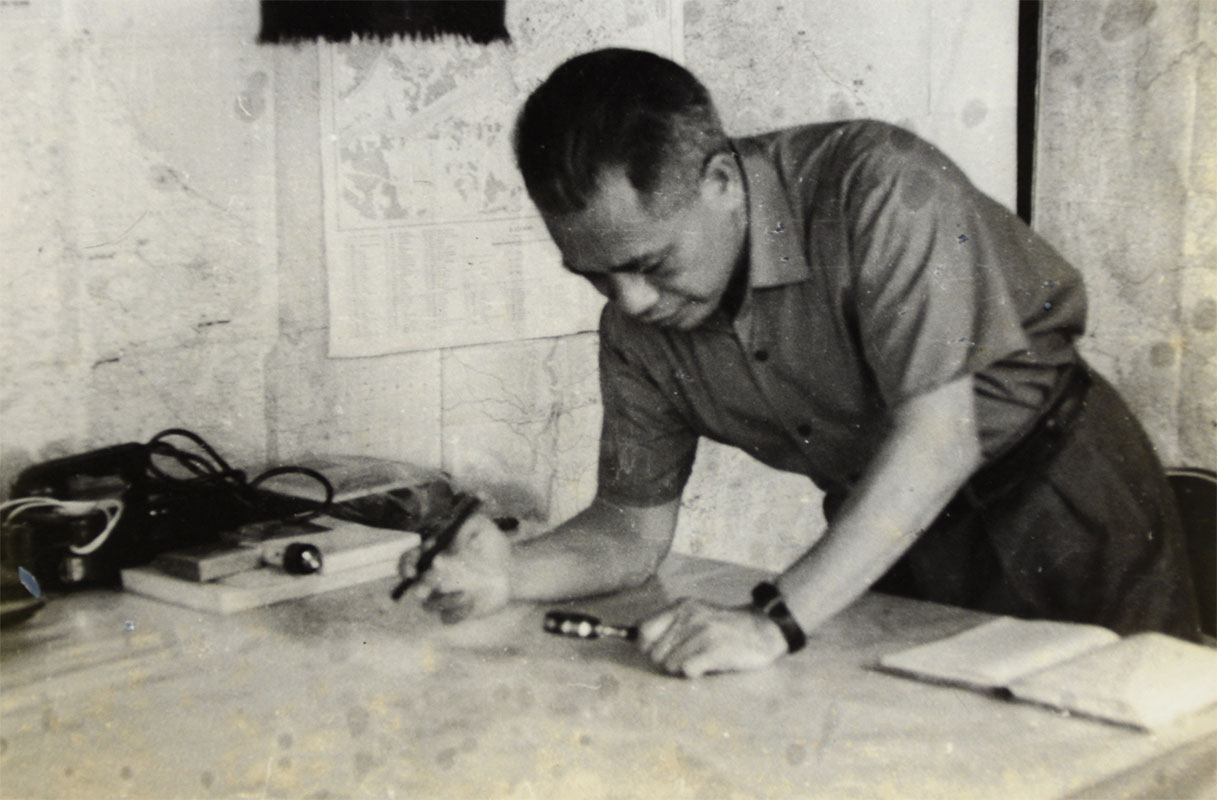 Thượng tướng Văn Tiến Dũng nghiên cứu, phân tích chiến dịch tại Sở Chỉ huy mặt trận Quảng Trị, tháng 4/1972.